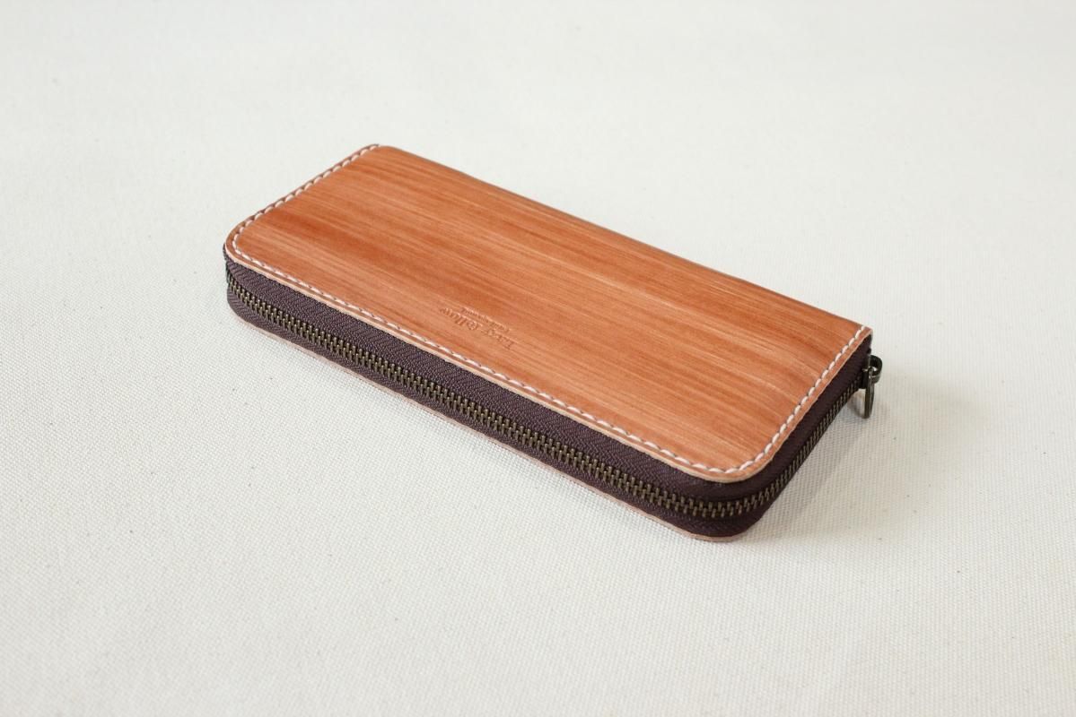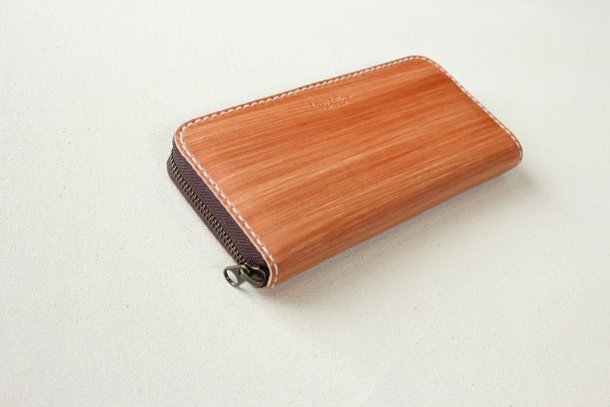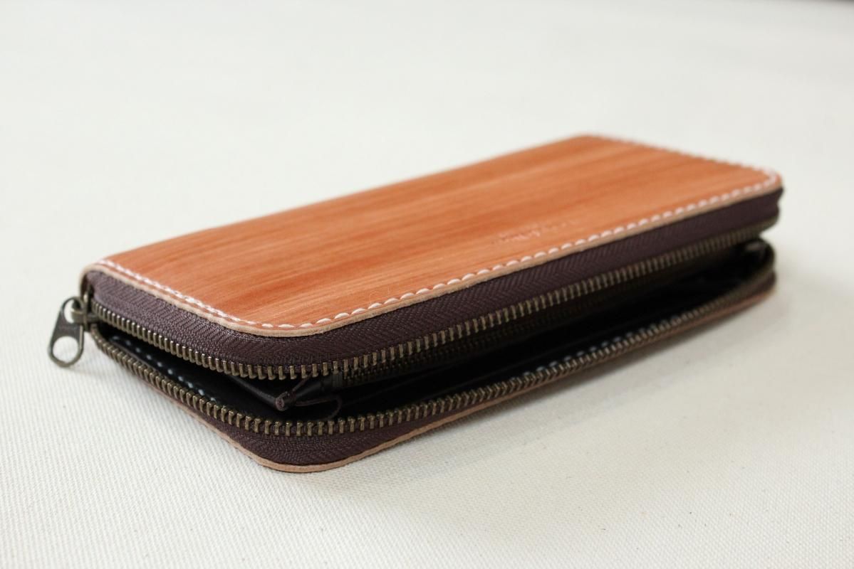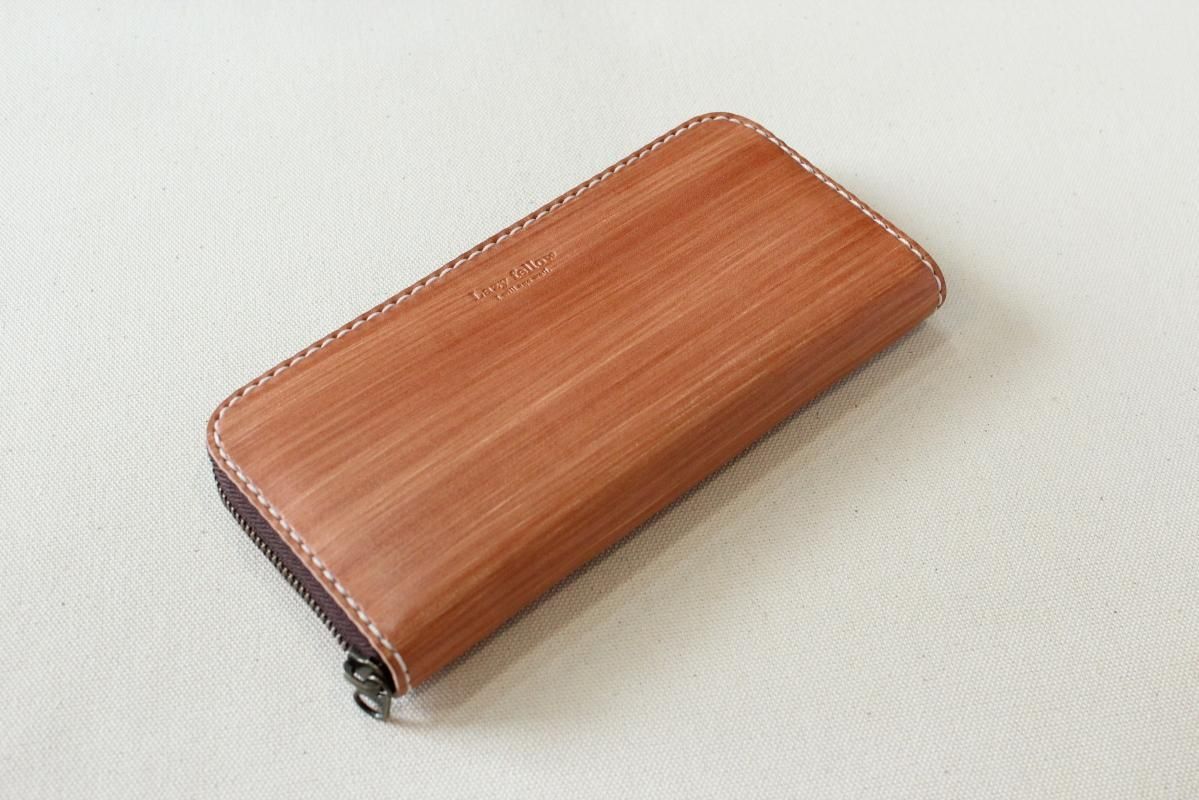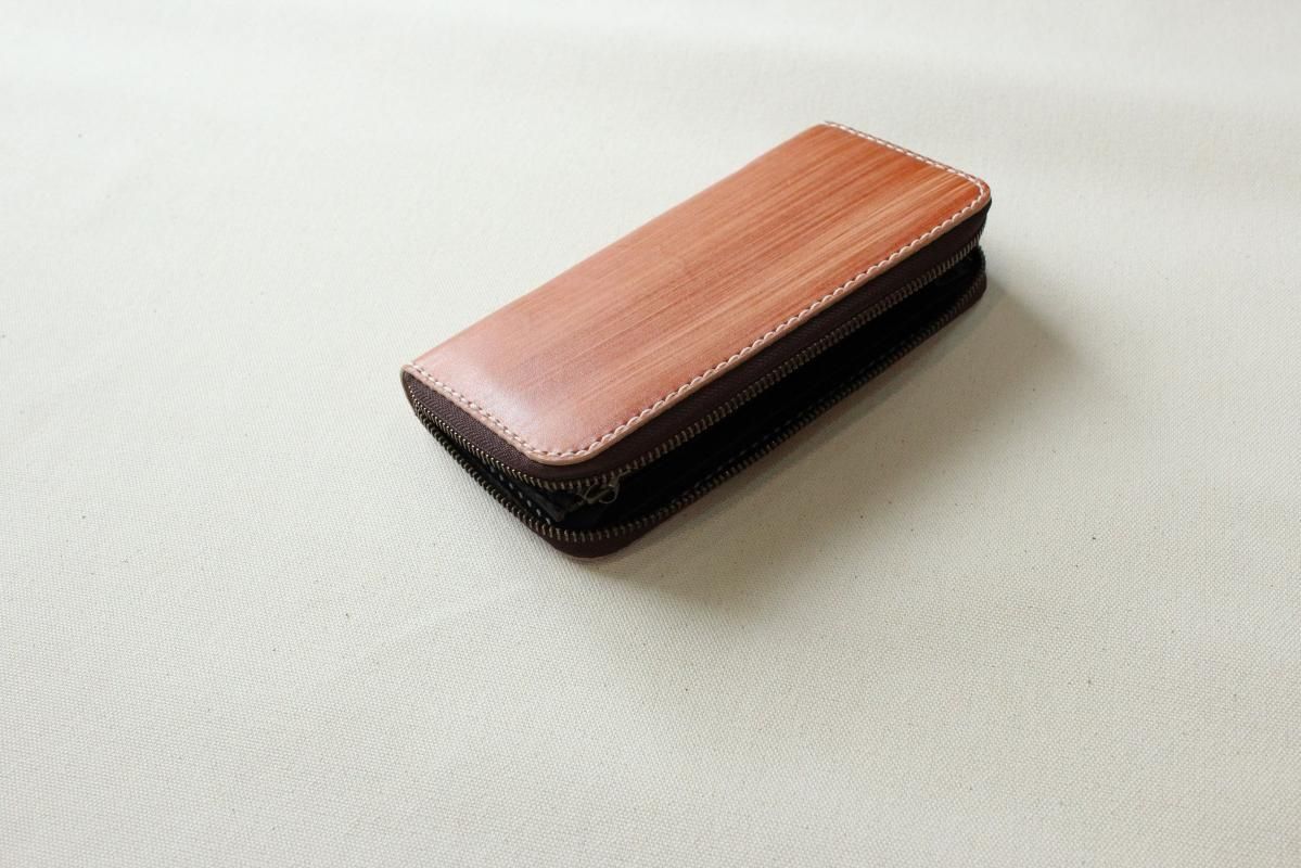 本商品はご注文(お支払い完了後)1ヶ月後の発送予定となります。 お待たせしてしまい申し訳ありませんが ご理解の上ご注文いただきますようお願いいたします。 木目のように見える革を使った長財布 柿渋を塗った刷毛の跡が木目のように見えるめずらしい革です。 国産の牛革を一つ一つ柿渋で染めています。 刷毛の跡が木目のように見えるます。 日本では古くから、柿渋を塗料や染料として、活用してきました。 防水・防虫・防腐・消臭等の効果があるといわれ 家屋や衣料品 近年では健康・美容素材としても使われている 天然素材のみでできた、無害な塗料です。 柿渋は匂いがきついことでも知られておりますが、 当商品は無臭に加工しております。(革のにおいはします) ※模様は1つ1つ手作業で染色しております。 木目の柄や濃さは写真と同じではない場合がありますのでご了承ください。 中にはカードが12枚入り 札入れも2箇所 札入れも2箇所 小銭入れもマチがあって取り出しやすいです。 カード入れ後ろにも 収納ポケットが2箇所ついております。 模様の出方濃さはひとつひとつ違います。 タンニンなめしの革ですので経年変化が楽しんでいただけます。 当店の商品は基本的に無料で修理をさせて頂いております。 ボタンが壊れたなどの修理については無料です。 ただし修理が不可能な破損、有料になる場合も一部ございますので 購入後、ご使用中に何かありましたら遠慮なくご相談ください size (閉じた状態)横幅 約20cm 縦幅 約10cm※閉じた状態のサイズ素材牛革(外側のみ柿渋染め使用)容量カード入れ 12箇所 札入れ 2箇所 小銭入れ1箇所 ファスナー・マチつき カード入れ後ろの収納ポケット 2箇所 ※革は天然素材ですので傷・色ムラ等がある場合がございます。 出来るだけきれいな部分を使用して製作しておりますがご理解頂きますようお願いします。 ※撮影時の光の加減・お使いのPC画面環境などにより、画像と実際の色が多少色が違う事がございます。 ♪当店で販売した商品については基本的に無償で修理をさせていただいております。 ただし、故意や経年劣化、部品の交換が必要な場合など一部修理代を頂く場合がございますので、まずご連絡ください。 creemaでも販売しております。 商品の評価はこちらをご参考にされてください。 ↓ ↓