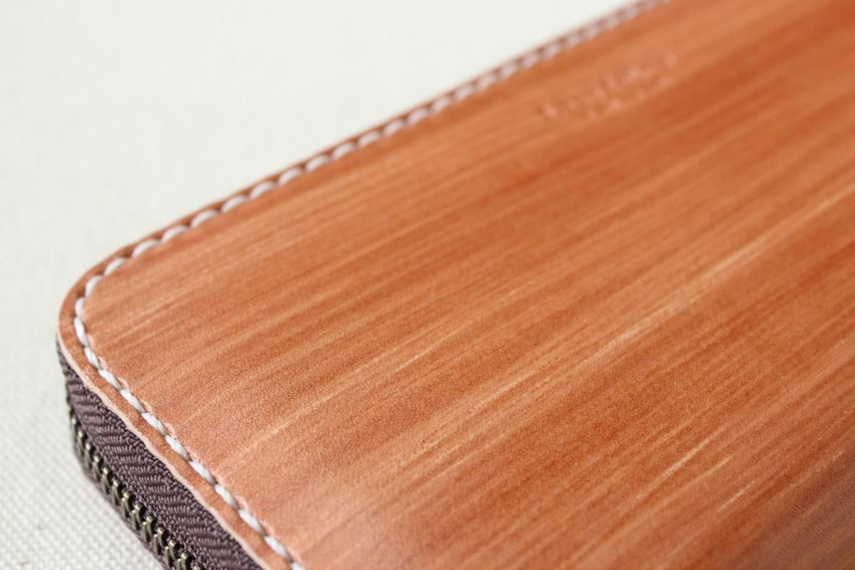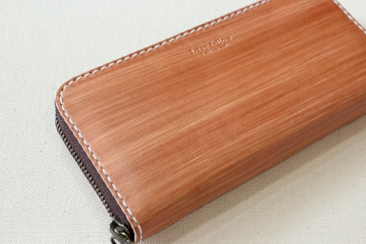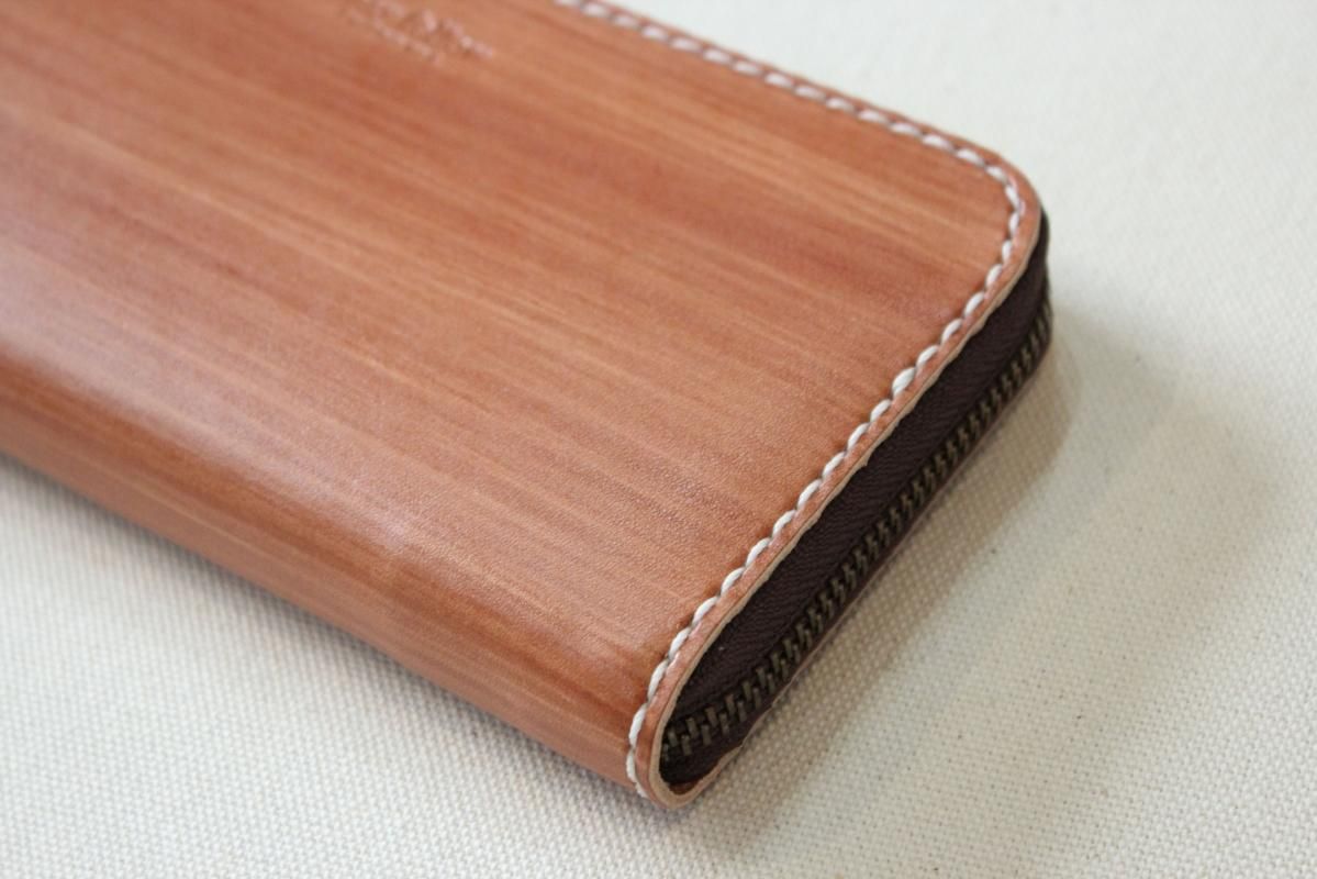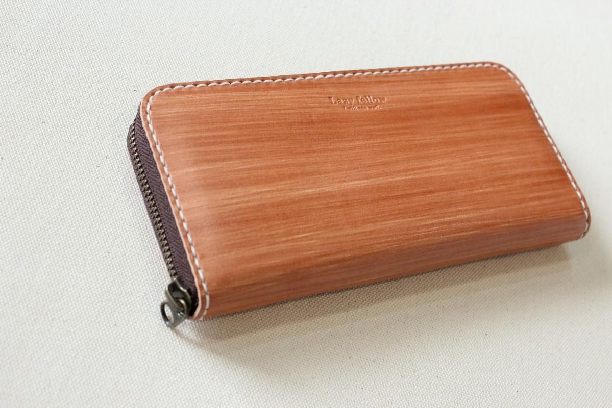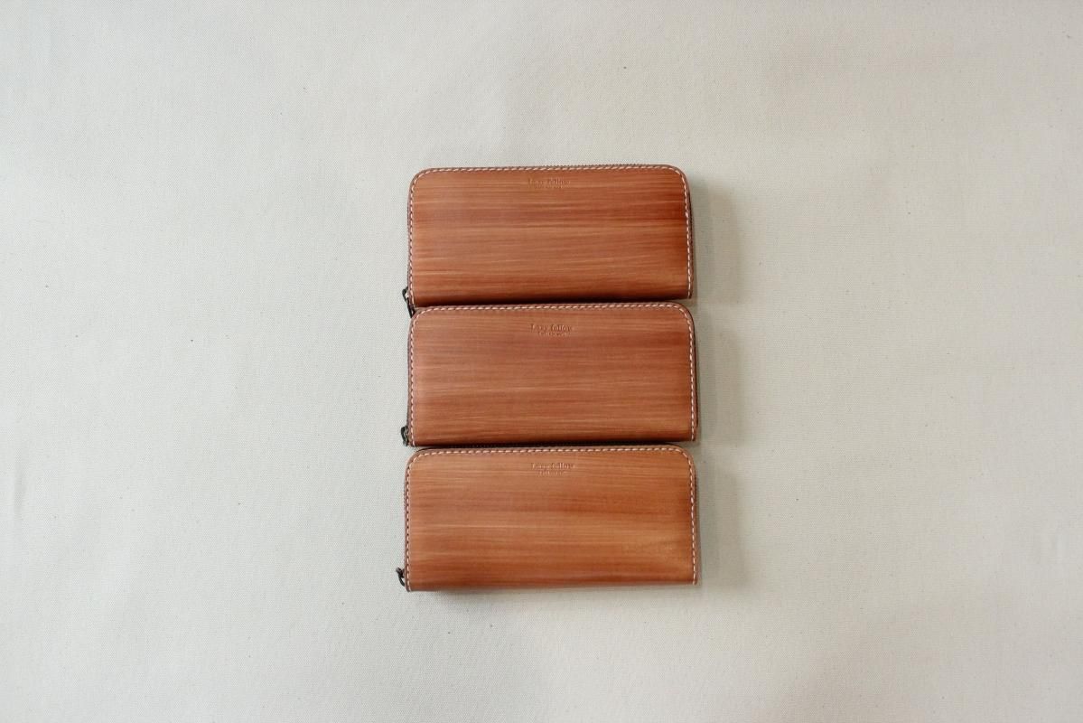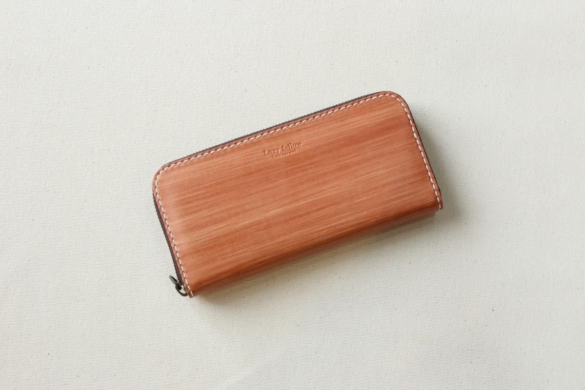 本商品はご注文(お支払い完了後)1ヶ月後の発送予定となります。 お待たせしてしまい申し訳ありませんが ご理解の上ご注文いただきますようお願いいたします。 木目のように見える革を使った長財布 柿渋を塗った刷毛の跡が木目のように見えるめずらしい革です。 国産の牛革を一つ一つ柿渋で染めています。 刷毛の跡が木目のように見えるます。 日本では古くから、柿渋を塗料や染料として、活用してきました。 防水・防虫・防腐・消臭等の効果があるといわれ 家屋や衣料品 近年では健康・美容素材としても使われている 天然素材のみでできた、無害な塗料です。 柿渋は匂いがきついことでも知られておりますが、 当商品は無臭に加工しております。(革のにおいはします) ※模様は1つ1つ手作業で染色しております。 木目の柄や濃さは写真と同じではない場合がありますのでご了承ください。 中にはカードが12枚入り 札入れも2箇所 札入れも2箇所 小銭入れもマチがあって取り出しやすいです。 カード入れ後ろにも 収納ポケットが2箇所ついております。 模様の出方濃さはひとつひとつ違います。 タンニンなめしの革ですので経年変化が楽しんでいただけます。 当店の商品は基本的に無料で修理をさせて頂いております。 ボタンが壊れたなどの修理については無料です。 ただし修理が不可能な破損、有料になる場合も一部ございますので 購入後、ご使用中に何かありましたら遠慮なくご相談ください size (閉じた状態)横幅 約20cm 縦幅 約10cm※閉じた状態のサイズ素材牛革(外側のみ柿渋染め使用)容量カード入れ 12箇所 札入れ 2箇所 小銭入れ1箇所 ファスナー・マチつき カード入れ後ろの収納ポケット 2箇所 ※革は天然素材ですので傷・色ムラ等がある場合がございます。 出来るだけきれいな部分を使用して製作しておりますがご理解頂きますようお願いします。 ※撮影時の光の加減・お使いのPC画面環境などにより、画像と実際の色が多少色が違う事がございます。 ♪当店で販売した商品については基本的に無償で修理をさせていただいております。 ただし、故意や経年劣化、部品の交換が必要な場合など一部修理代を頂く場合がございますので、まずご連絡ください。 creemaでも販売しております。 商品の評価はこちらをご参考にされてください。 ↓ ↓