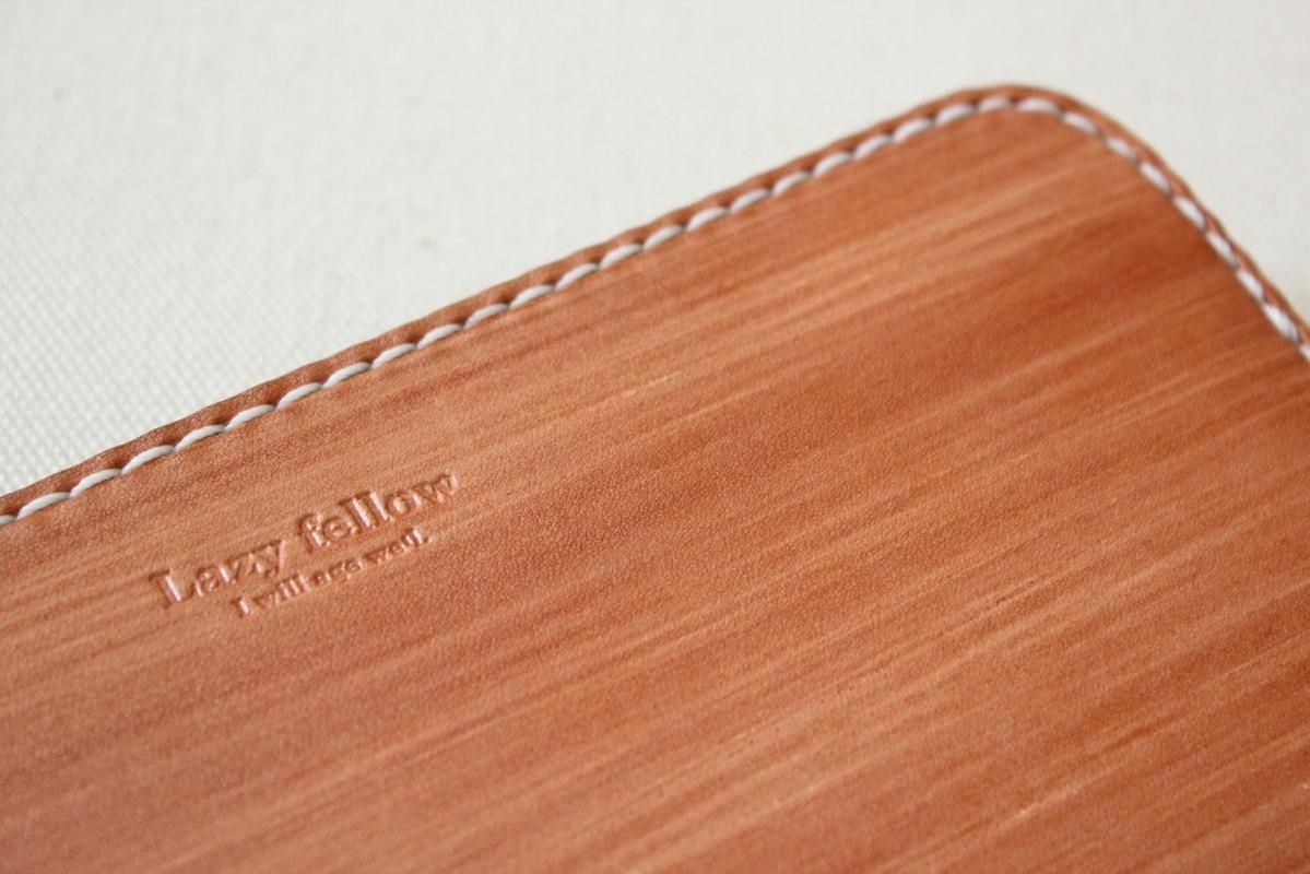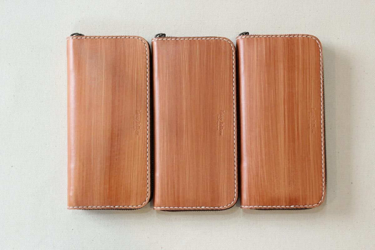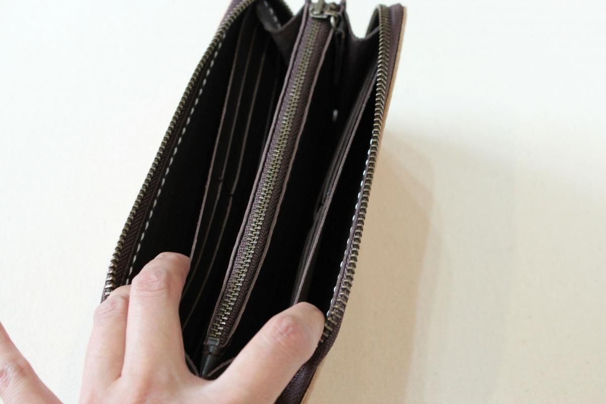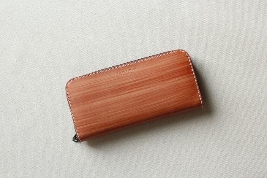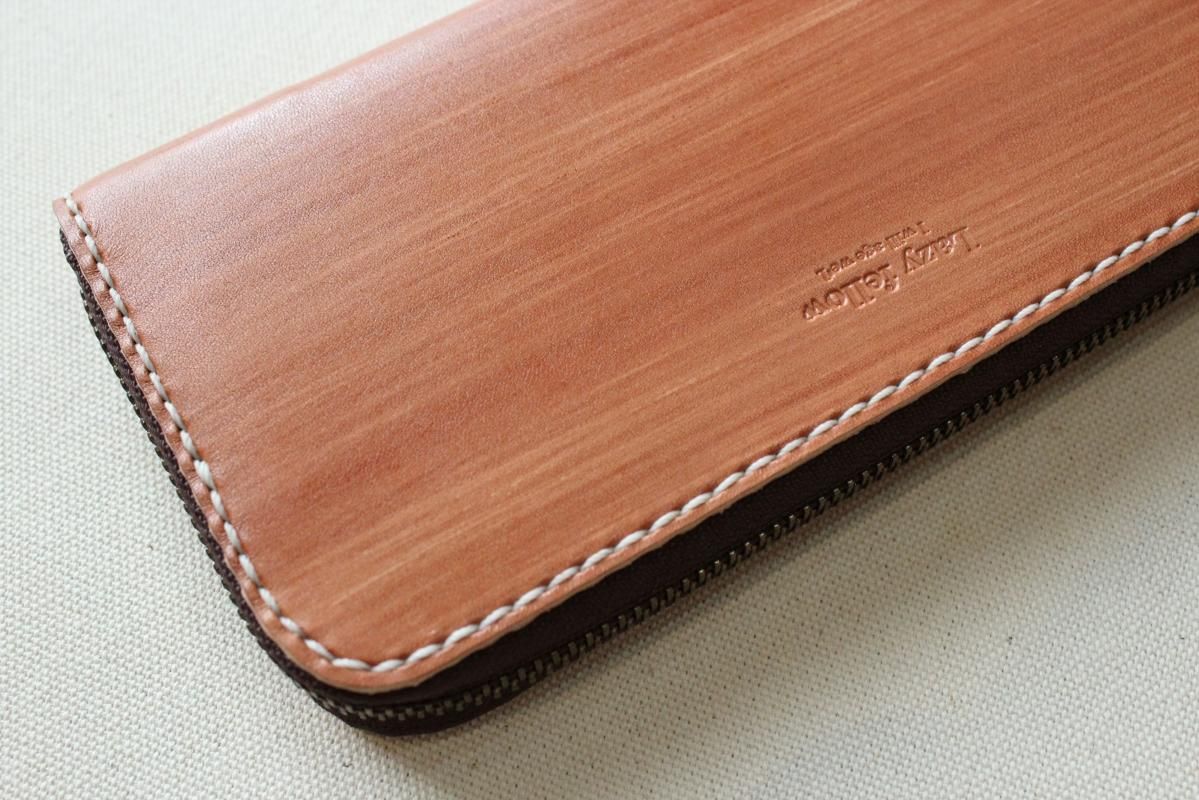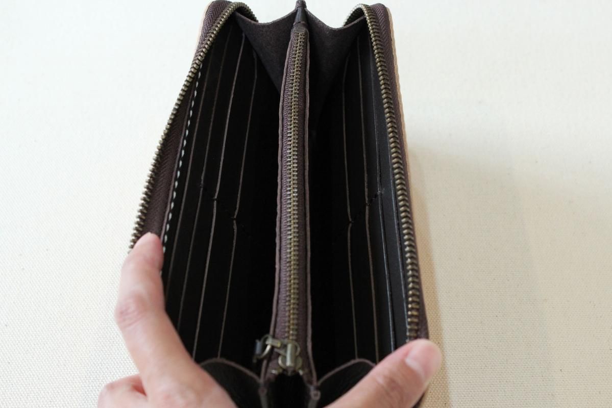本商品はご注文(お支払い完了後)1ヶ月後の発送予定となります。 お待たせしてしまい申し訳ありませんが ご理解の上ご注文いただきますようお願いいたします。 木目のように見える革を使った長財布 柿渋を塗った刷毛の跡が木目のように見えるめずらしい革です。 国産の牛革を一つ一つ柿渋で染めています。 刷毛の跡が木目のように見えるます。 日本では古くから、柿渋を塗料や染料として、活用してきました。 防水・防虫・防腐・消臭等の効果があるといわれ 家屋や衣料品 近年では健康・美容素材としても使われている 天然素材のみでできた、無害な塗料です。 柿渋は匂いがきついことでも知られておりますが、 当商品は無臭に加工しております。(革のにおいはします) ※模様は1つ1つ手作業で染色しております。 木目の柄や濃さは写真と同じではない場合がありますのでご了承ください。 中にはカードが12枚入り 札入れも2箇所 札入れも2箇所 小銭入れもマチがあって取り出しやすいです。 カード入れ後ろにも 収納ポケットが2箇所ついております。 模様の出方濃さはひとつひとつ違います。 タンニンなめしの革ですので経年変化が楽しんでいただけます。 当店の商品は基本的に無料で修理をさせて頂いております。 ボタンが壊れたなどの修理については無料です。 ただし修理が不可能な破損、有料になる場合も一部ございますので 購入後、ご使用中に何かありましたら遠慮なくご相談ください size (閉じた状態)横幅 約20cm 縦幅 約10cm※閉じた状態のサイズ素材牛革(外側のみ柿渋染め使用)容量カード入れ 12箇所 札入れ 2箇所 小銭入れ1箇所 ファスナー・マチつき カード入れ後ろの収納ポケット 2箇所 ※革は天然素材ですので傷・色ムラ等がある場合がございます。 出来るだけきれいな部分を使用して製作しておりますがご理解頂きますようお願いします。 ※撮影時の光の加減・お使いのPC画面環境などにより、画像と実際の色が多少色が違う事がございます。 ♪当店で販売した商品については基本的に無償で修理をさせていただいております。 ただし、故意や経年劣化、部品の交換が必要な場合など一部修理代を頂く場合がございますので、まずご連絡ください。 creemaでも販売しております。 商品の評価はこちらをご参考にされてください。 ↓ ↓