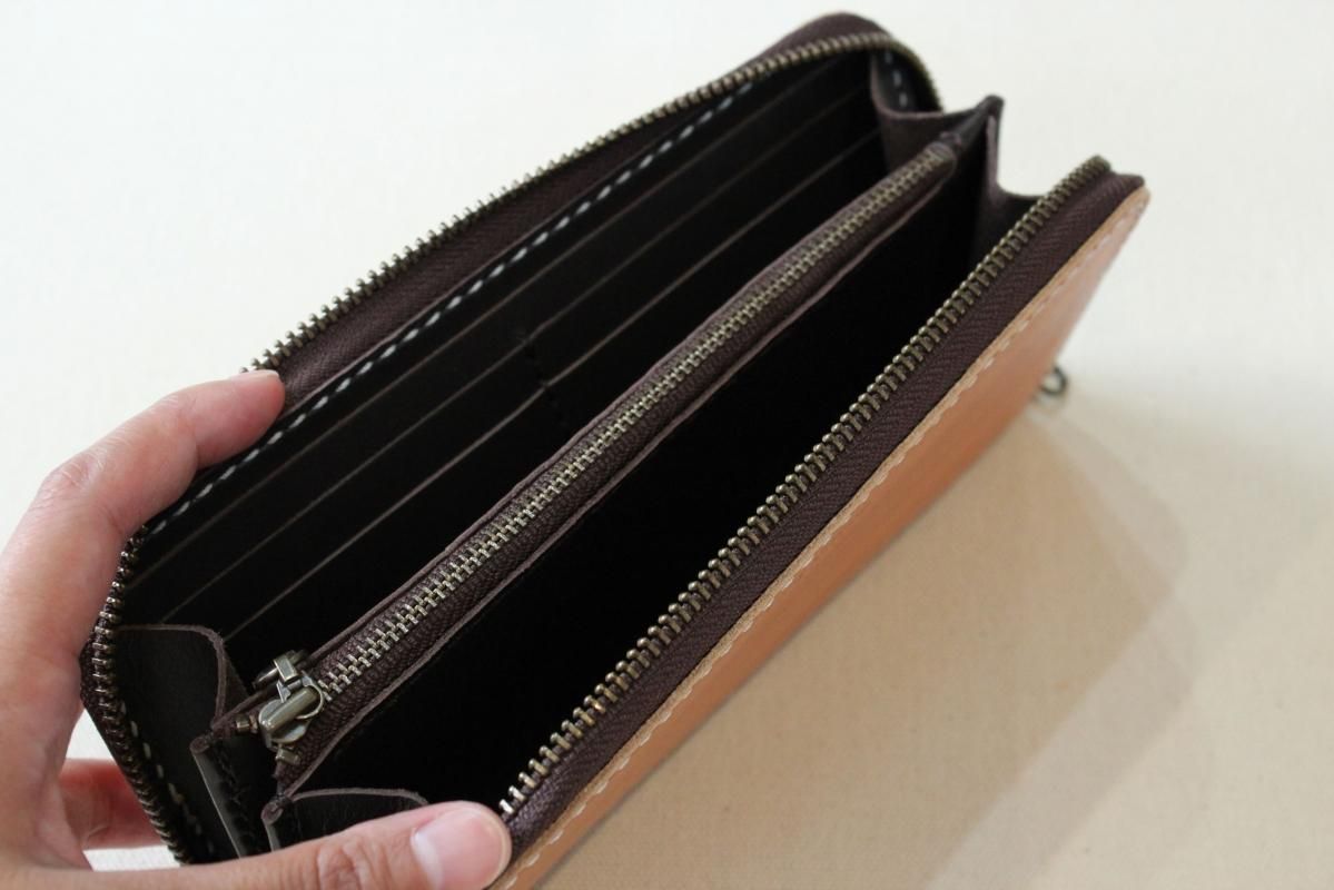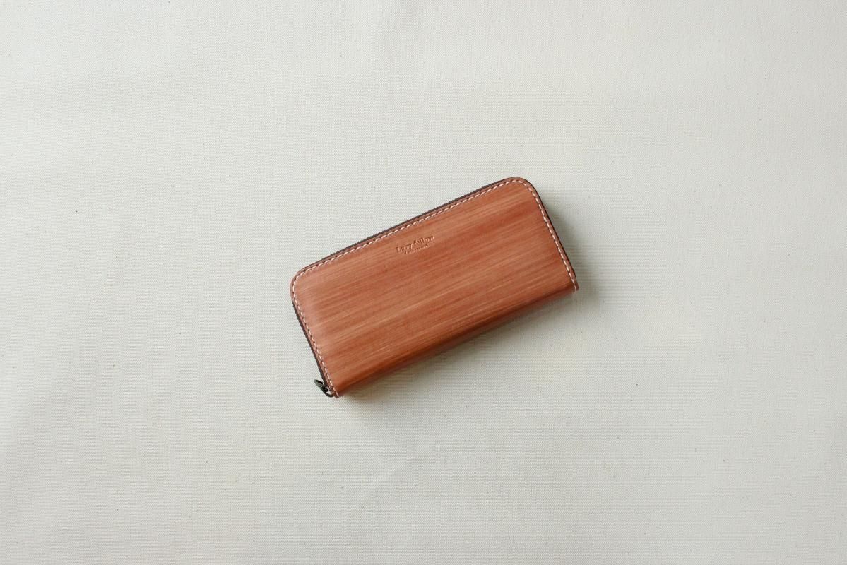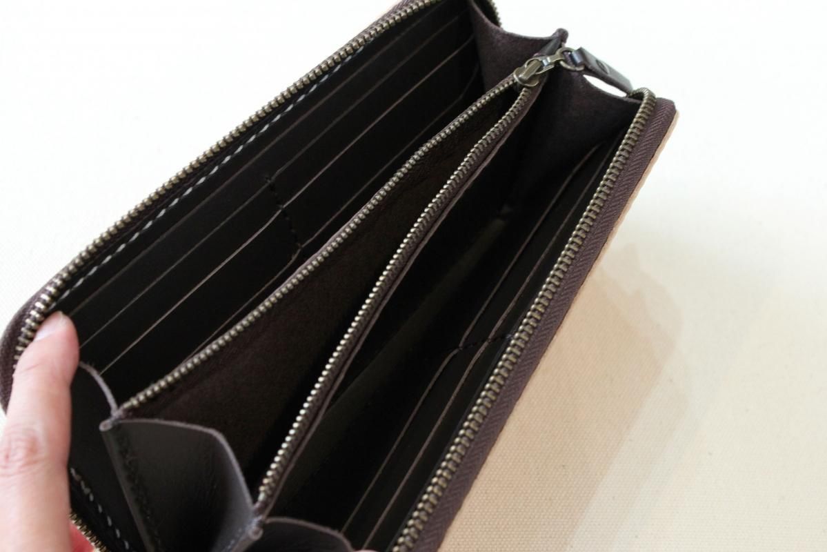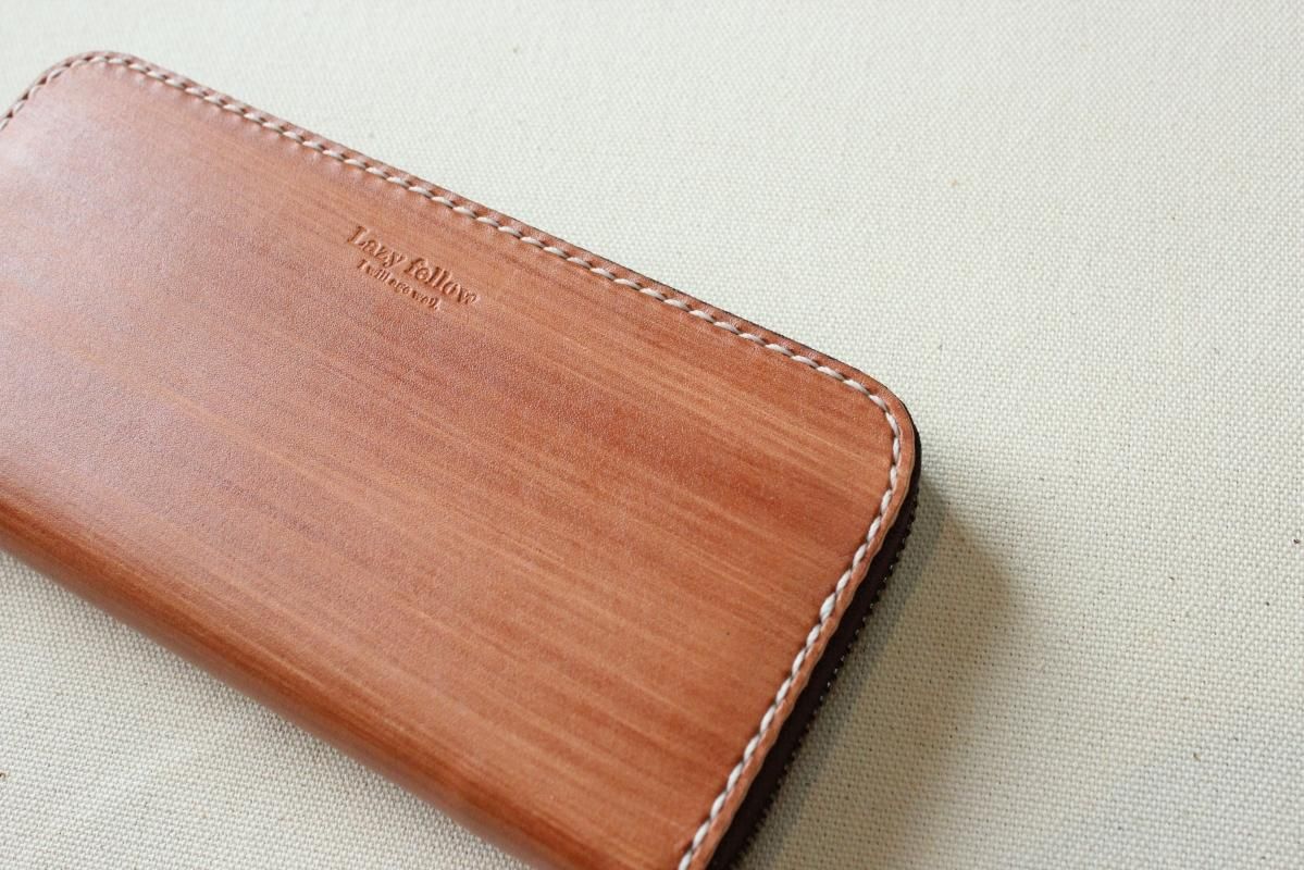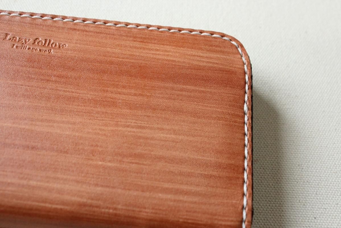 本商品はご注文(お支払い完了後)1ヶ月後の発送予定となります。 お待たせしてしまい申し訳ありませんが ご理解の上ご注文いただきますようお願いいたします。 木目のように見える革を使った長財布 柿渋を塗った刷毛の跡が木目のように見えるめずらしい革です。 国産の牛革を一つ一つ柿渋で染めています。 刷毛の跡が木目のように見えるます。 日本では古くから、柿渋を塗料や染料として、活用してきました。 防水・防虫・防腐・消臭等の効果があるといわれ 家屋や衣料品 近年では健康・美容素材としても使われている 天然素材のみでできた、無害な塗料です。 柿渋は匂いがきついことでも知られておりますが、 当商品は無臭に加工しております。(革のにおいはします) ※模様は1つ1つ手作業で染色しております。 木目の柄や濃さは写真と同じではない場合がありますのでご了承ください。 中にはカードが12枚入り 札入れも2箇所 札入れも2箇所 小銭入れもマチがあって取り出しやすいです。 カード入れ後ろにも 収納ポケットが2箇所ついております。 模様の出方濃さはひとつひとつ違います。 タンニンなめしの革ですので経年変化が楽しんでいただけます。 当店の商品は基本的に無料で修理をさせて頂いております。 ボタンが壊れたなどの修理については無料です。 ただし修理が不可能な破損、有料になる場合も一部ございますので 購入後、ご使用中に何かありましたら遠慮なくご相談ください size (閉じた状態)横幅 約20cm 縦幅 約10cm※閉じた状態のサイズ素材牛革(外側のみ柿渋染め使用)容量カード入れ 12箇所 札入れ 2箇所 小銭入れ1箇所 ファスナー・マチつき カード入れ後ろの収納ポケット 2箇所 ※革は天然素材ですので傷・色ムラ等がある場合がございます。 出来るだけきれいな部分を使用して製作しておりますがご理解頂きますようお願いします。 ※撮影時の光の加減・お使いのPC画面環境などにより、画像と実際の色が多少色が違う事がございます。 ♪当店で販売した商品については基本的に無償で修理をさせていただいております。 ただし、故意や経年劣化、部品の交換が必要な場合など一部修理代を頂く場合がございますので、まずご連絡ください。 creemaでも販売しております。 商品の評価はこちらをご参考にされてください。 ↓ ↓